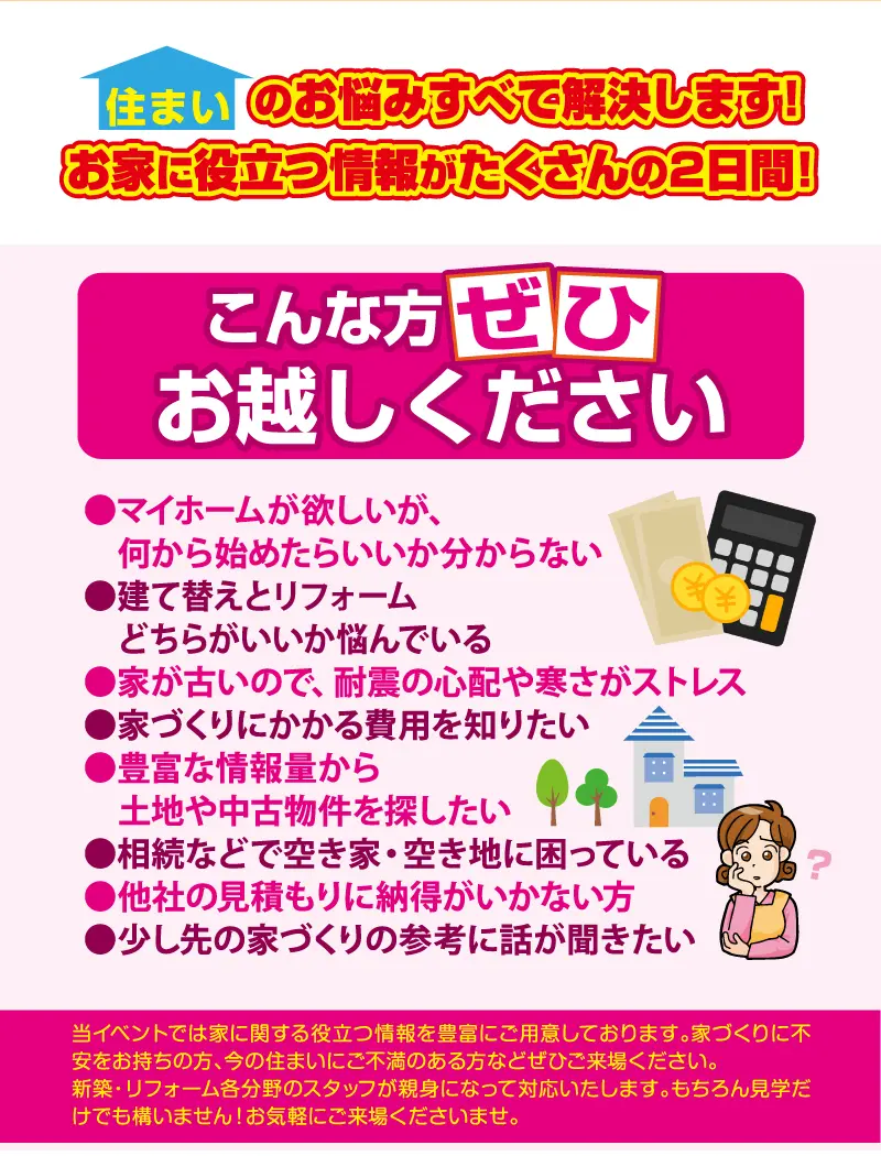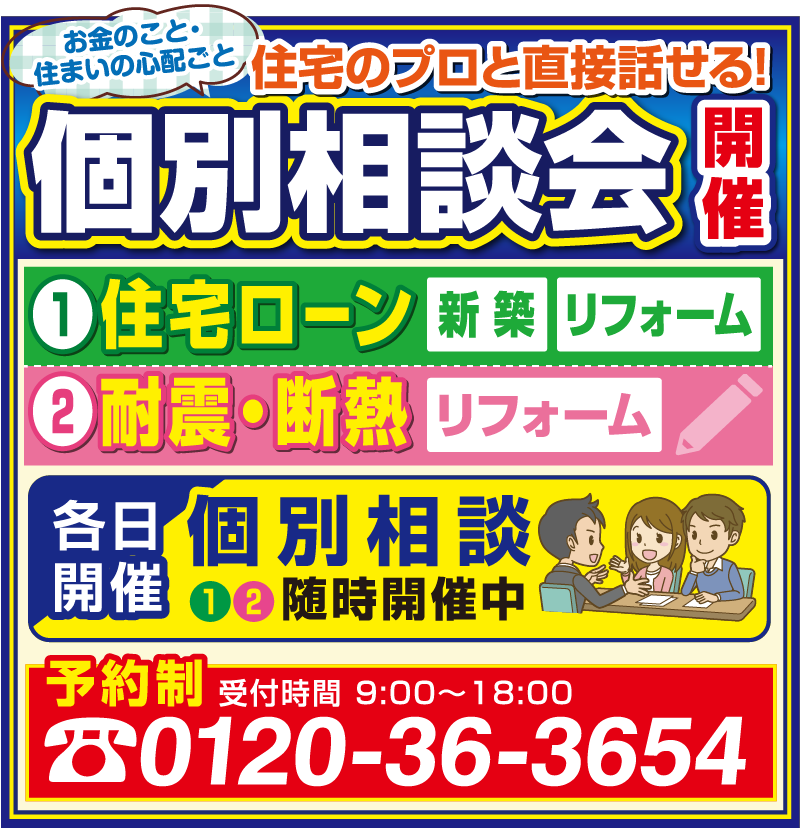 必須 ご来場希望日時 --- 必須 相談したい内容 リフォーム・リノベーションについて新築住宅についてその他 任意 個別相談会参加(予約制) 希望する希望しない 必須 お名前 必須 ふりがな 必須 郵便番号 必須 ご住所 必須 メールアドレス 必須 電話番号 差支えなければ、以下の質問にもお答えください。 任意 新築・リフォーム完了希望時期について 時期検討中・これから検討すぐにでも1ケ月以内1ケ月~半年以内半年~1年以内1年~2年以内2年~3年以内3年以上先 任意 建物・土地について 現在所有している(自己所有)現在所有している(親族所有)購入予定物件が決定している探している / 探しはじめ 任意 このイベントを知ったきっかけ InstagramLINEfacebookホームページWEB検索バナー広告新聞折込チラシポスト投函チラシご紹介その他 任意 ご質問・ご要望等 【自動メールが届かない場合】 お申し込み後、すぐに確認メールが自動送信されます。 届かない場合、迷惑メール設定によりブロックされている可能性があります。 特に docomo・au/ezweb・softbank の方は設定をご確認ください。 ご不明点などございましたら、お電話でもお気軽にお問合せください。0120-363654 このまま進むことで、当社の個人情報取扱方針にご同意いただいたものとしてお手続きを承ります。 内容をご確認のうえ、よろしければボタンを押してお進みください。 ありがとうございます。メッセージは送信されました。 15分以内に確認用の自動返信メールが届きます。 メールが届かない場合は、メールアドレスが誤っているか、確認メールが迷惑メールフォルダ等に振り分けられている、ドメイン指定で拒否されている可能性がありますので、再度ご確認をお願いいたします。 また、ご使用の端末/メールシステムの空き容量不足により、メールを受信できない場合もございます。その際は空き容量の確保をお願いいたします。 よろしくお願いいたします。 閉じる